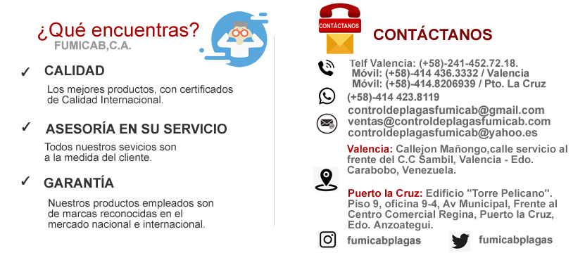 3. Los diferentes laboratorios a nivel mundial fabrican constantemente productos de alta calidad y efectividad. Estos productos debidamente aplicados y en manos expertas como en las de Control de Plagas FUMICAB, dan los mejores resultados en el control de plagas.